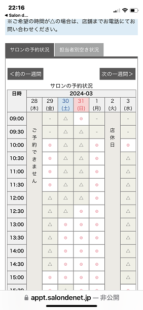 2.「予約」に進み、メニュー日時、スタッフを選択します。