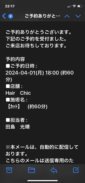 3.以上で予約完了です。予約完了後に自動メールで予約内容が届きます。